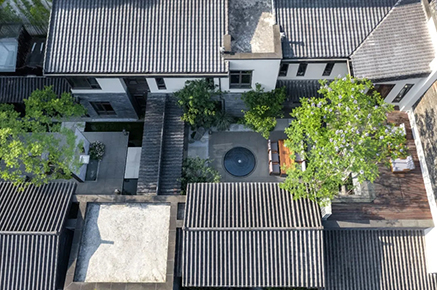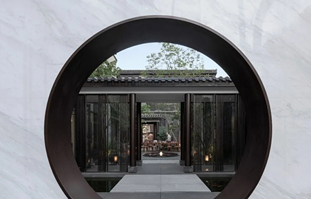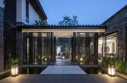 青磚黛瓦,雅致的建筑立面,大面積落地玻璃窗,模糊室內外空間,院里綠意透入室內。