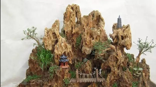 石造景,可橫層劈截或粘接組合,特別適宜于樹石盆景和駁岸、散點石配置,做山水盆景時,橫