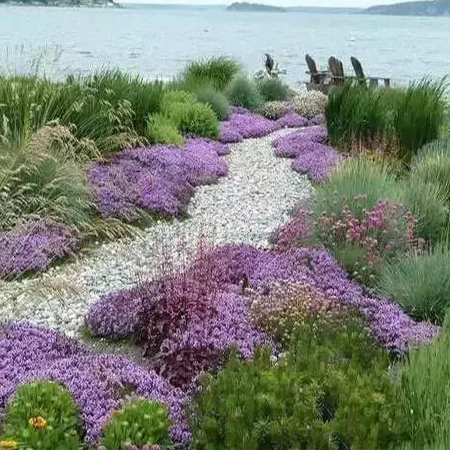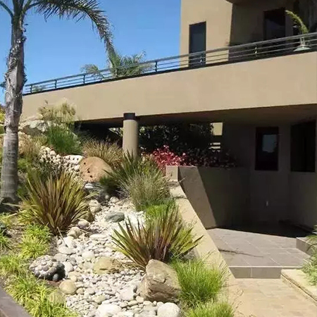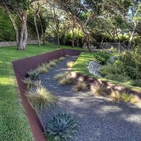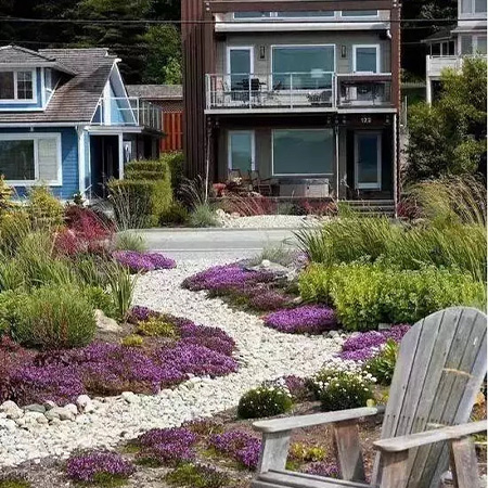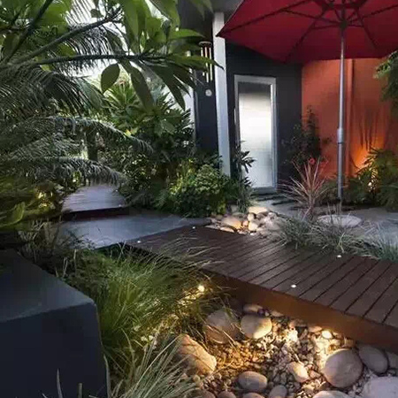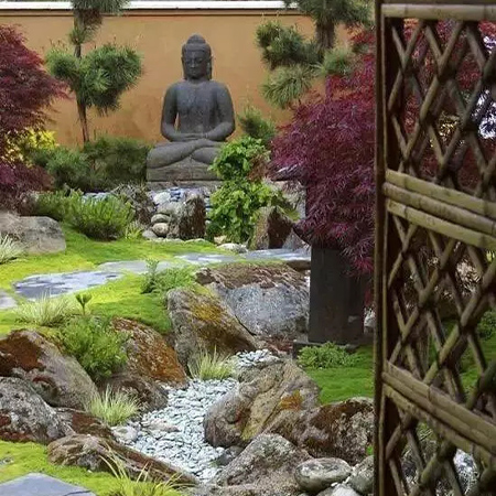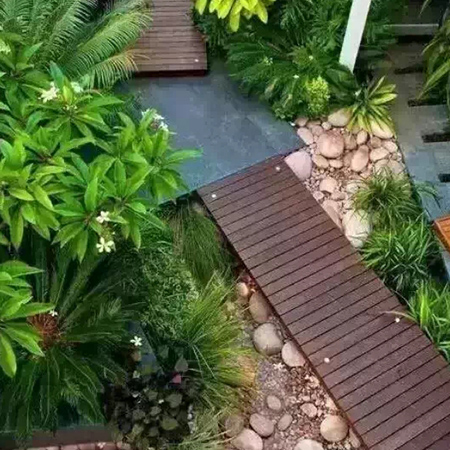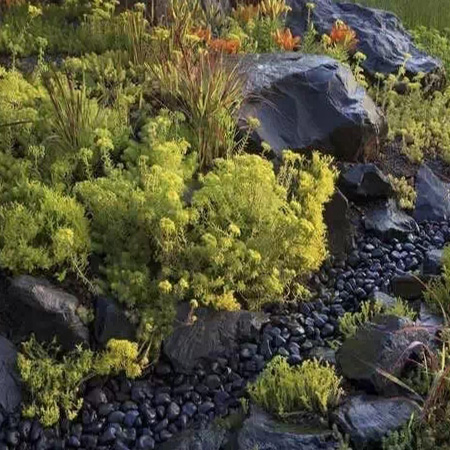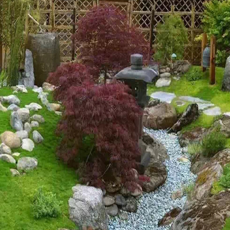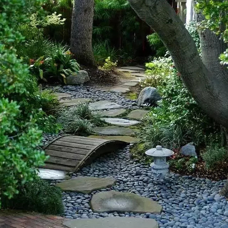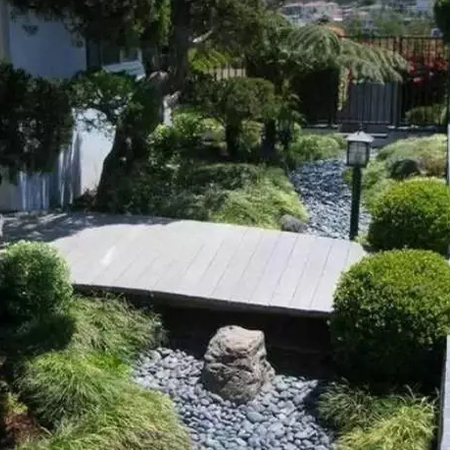 本叫枯山水,有禪意,節(jié)水,低維護,方便介入。有時,旱溪也可以做河底,甚至