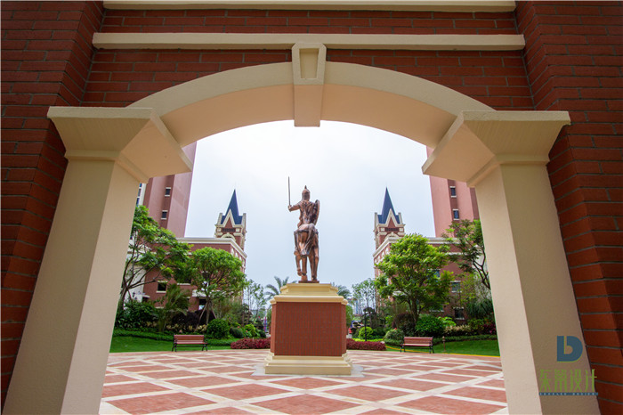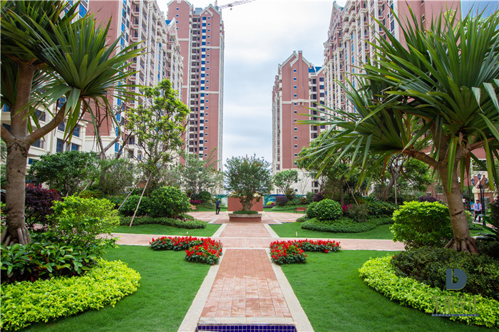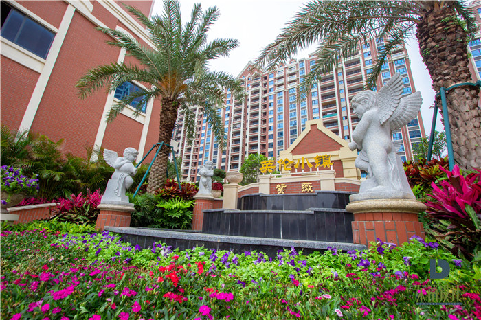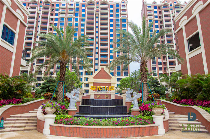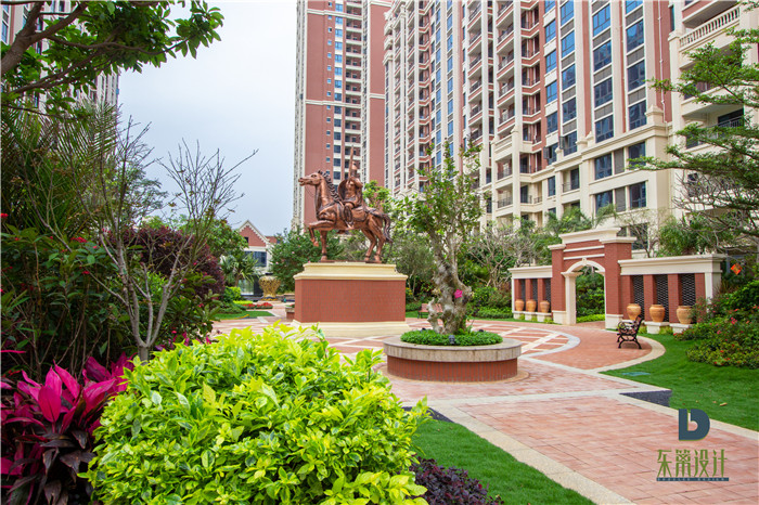 從景觀上看整體上以英式規(guī)則式園林為風(fēng)格為設(shè)計(jì)主調(diào),結(jié)合綠蔭清幽的樹陣及規(guī)整的花壇盡顯英倫理性與秩序,嚴(yán)謹(jǐn)和精致。180㎡的景觀疊水水景,配以典雅的駱駝雕塑,給動(dòng)感的水景增加一番風(fēng)味。