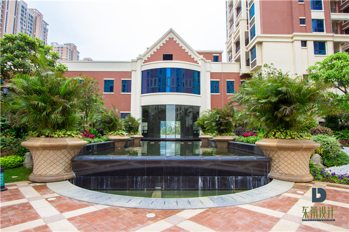 設(shè)計(jì)結(jié)合地形高差設(shè)計(jì)有對(duì)稱感的旋轉(zhuǎn)景觀樓梯,濃郁英倫風(fēng)味的入口景觀跌水,配以趣味雕塑、噴泉以及兩邊對(duì)稱的景墻,給人振奮人心的勃勃生機(jī)。潔白的水花,深紅的景墻,展現(xiàn)在入口廣場(chǎng)中央綠色的花叢中,典雅之情盡現(xiàn)。